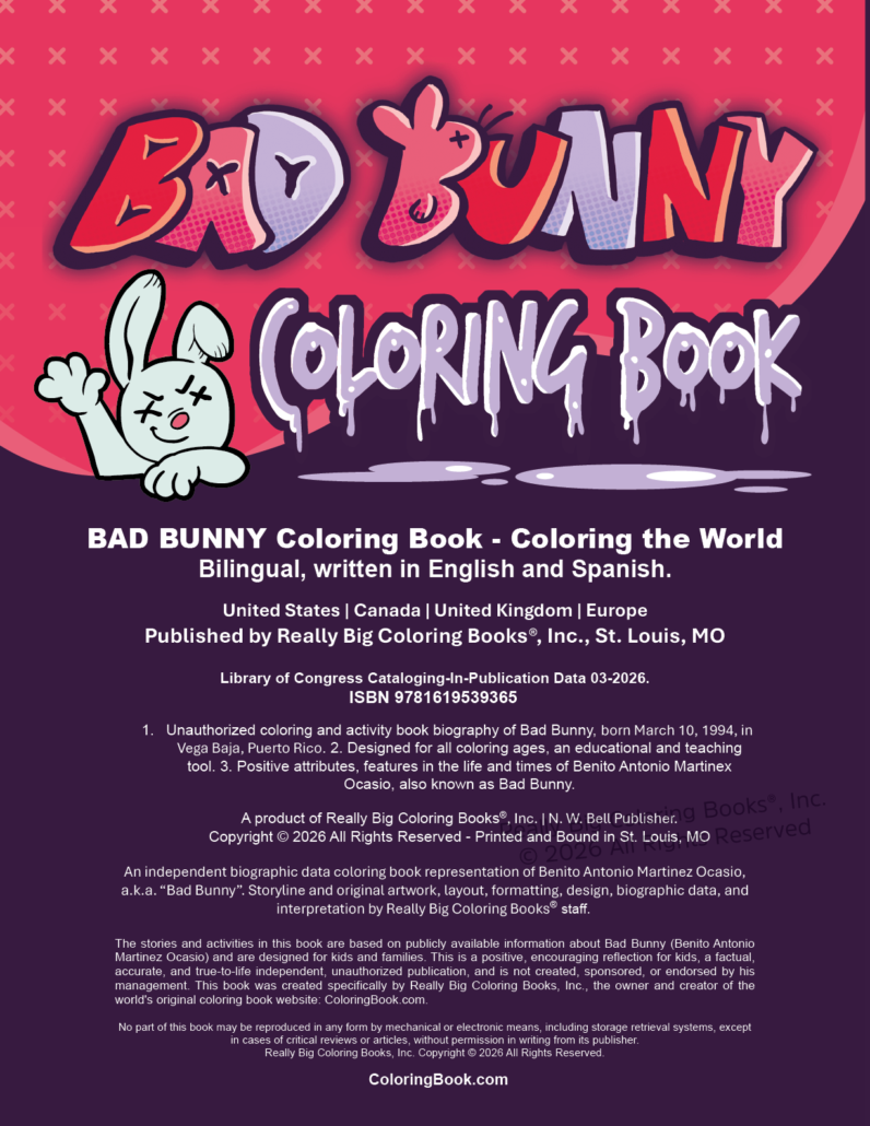 The Bad Bunny Coloring Book: Coloring the World is a fun, educational, and independently created coloring and activity book inspired by global music superstar Bad Bunny, born Benito Antonio Martínez Ocasio. This publication is designed especially for kids, families, and fans. Including a positive, age‑appropriate way to explore his story, creativity, and Puerto Rican roots. With bold illustrations, simple text, and engaging activities, it works perfectly as a gift, classroom resource, or family project.