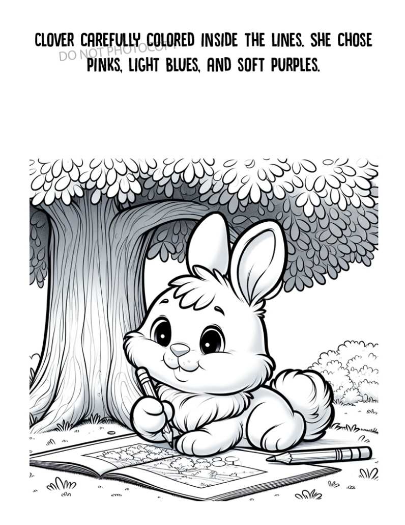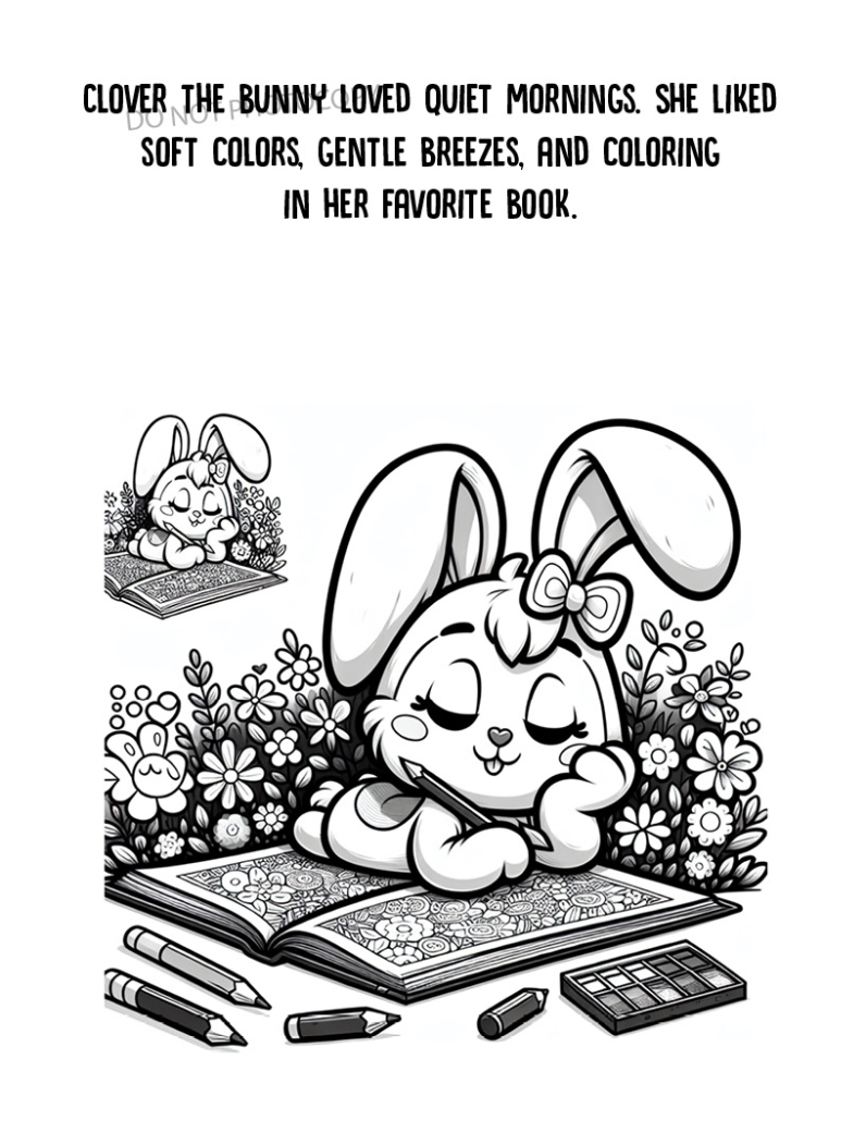 Clover the bunny loves quiet mornings, soft colors, and cozy stories—just like many young children. She enjoys gentle breezes, pastel skies, and careful coloring that stays neatly inside the lines. Clover is the perfect friend for thoughtful, quieter kids who like to take their time and choose just the right crayon.