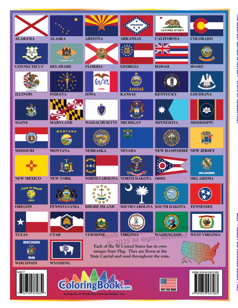 This fun Connecticut State Coloring Books are 8.5” x 11” with a high-quality full color card stock cover. Each inside page is a high-bright, white paper that children can use crayons, colored pencils, magic markers and even water colors on!