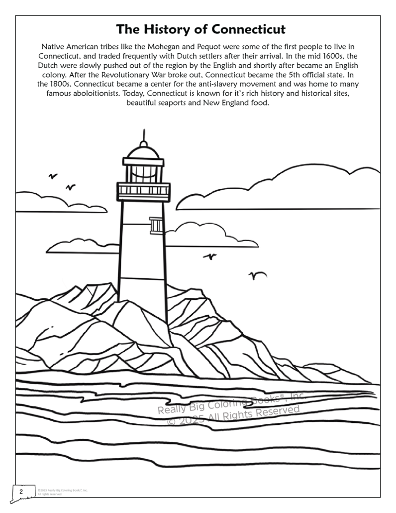 Connecticut State Coloring Book. This 32-page book is used as a teaching and learning tool. This Connecticut State Coloring, Activity and Game Book is designed to be a fun, educational activity book to help young children understand facts about the State of Connecticut. Through fun activities like matching, complete the state outline, flag matching and more, this interactive coloring book is both entertaining and educational. This approach to teaching captures both the imagination and creativity of students, and helps them become excited to learn about all of the state of Connecticut.