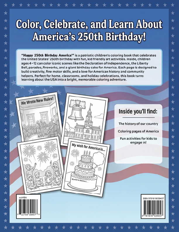 “Happy 250th Birthday America!” is a 24‑page patriotic children’s coloring book that celebrates the United States’ 250th anniversary with fun, kid‑friendly artwork for ages 4–12. This expanded edition offers more pages, more variety, and more chances to explore American history through creative, hands‑on coloring.