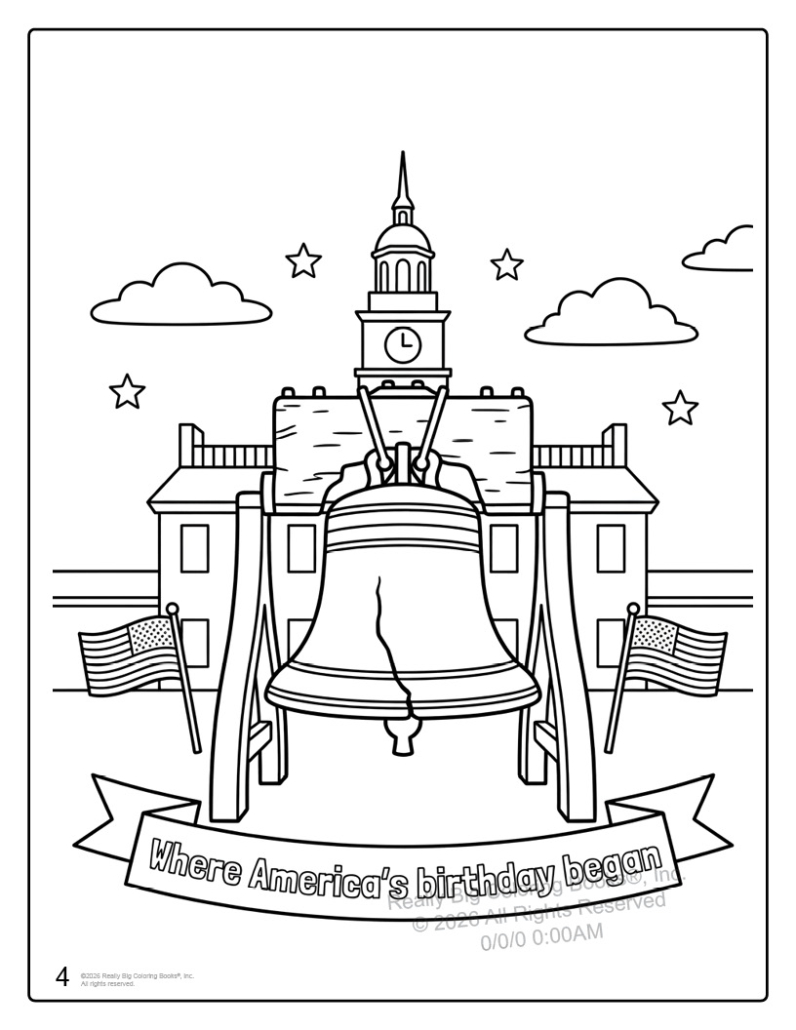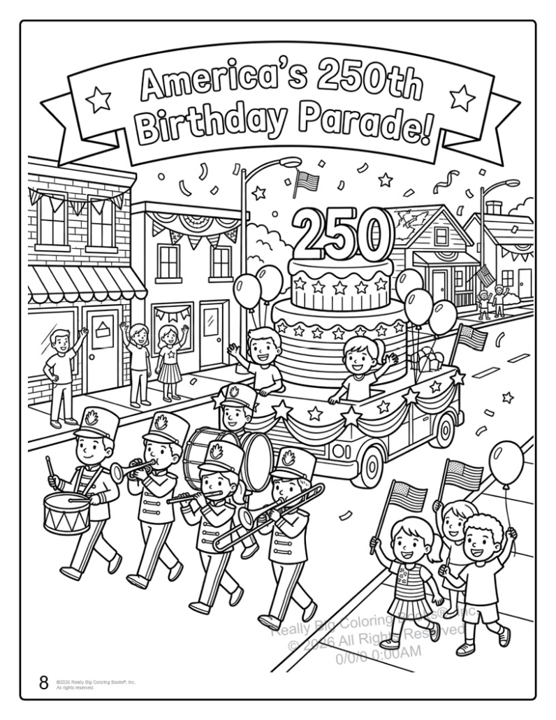 Children explore iconic moments and symbols from American history while coloring bold, easy‑to‑fill designs. Pages feature the Declaration of Independence, the Liberty Bell, Independence Hall, a waving American flag, 4th of July fireworks, parades, community helpers, family picnics, and a big birthday cake for America’s 250th birthday. Artwork ranges from simple scenes ideal for preschool and kindergarten to more detailed pages that challenge older elementary kids, making it a great mixed‑age resource.