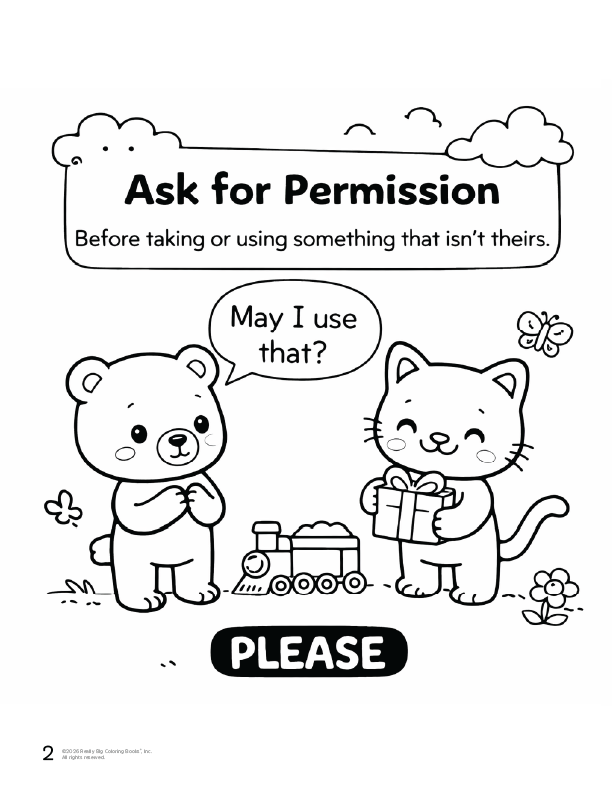 Manners for Kids Imprint Coloring Book details covering coughs and sneezes with an elbow or tissue protects others from germs and shows care for the group. Sharing toys, supplies, and games builds cooperation and friendship skills. Cleaning up after playtime or meals teaches responsibility and pride in shared spaces.