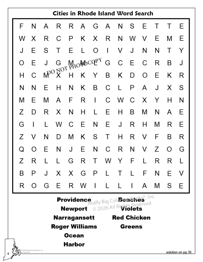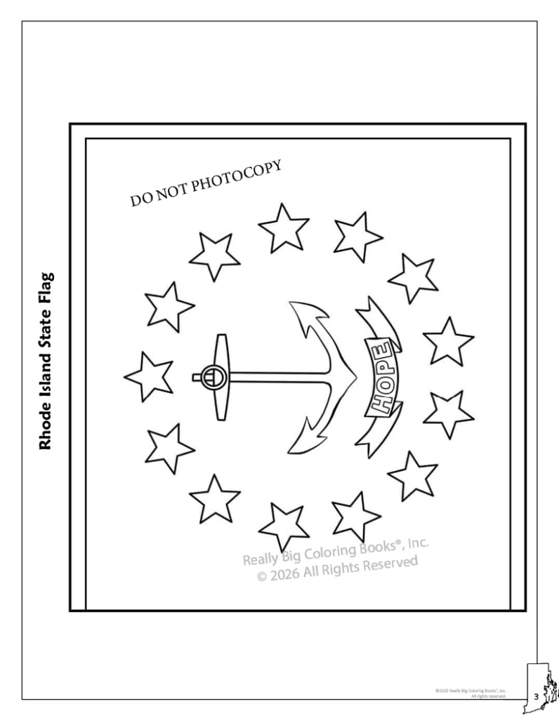 Rhode Island State Coloring Book. This 32-page book is used as a teaching and learning tool. This Rhode Island State Coloring, Activity and Game Book is designed to be a fun, educational activity book to help young children understand facts about the State of Rhode Island. Through fun activities like matching, complete the state outline, flag matching and more, this interactive coloring book is both entertaining and educational. This approach to teaching captures both the imagination and creativity of students, and helps them become excited to learn about all of the state of Rhode Island.