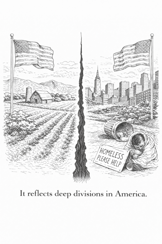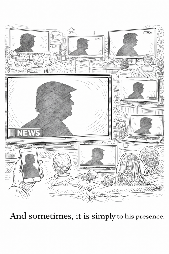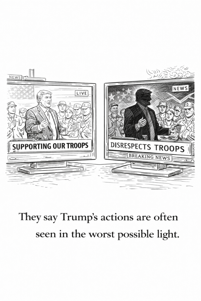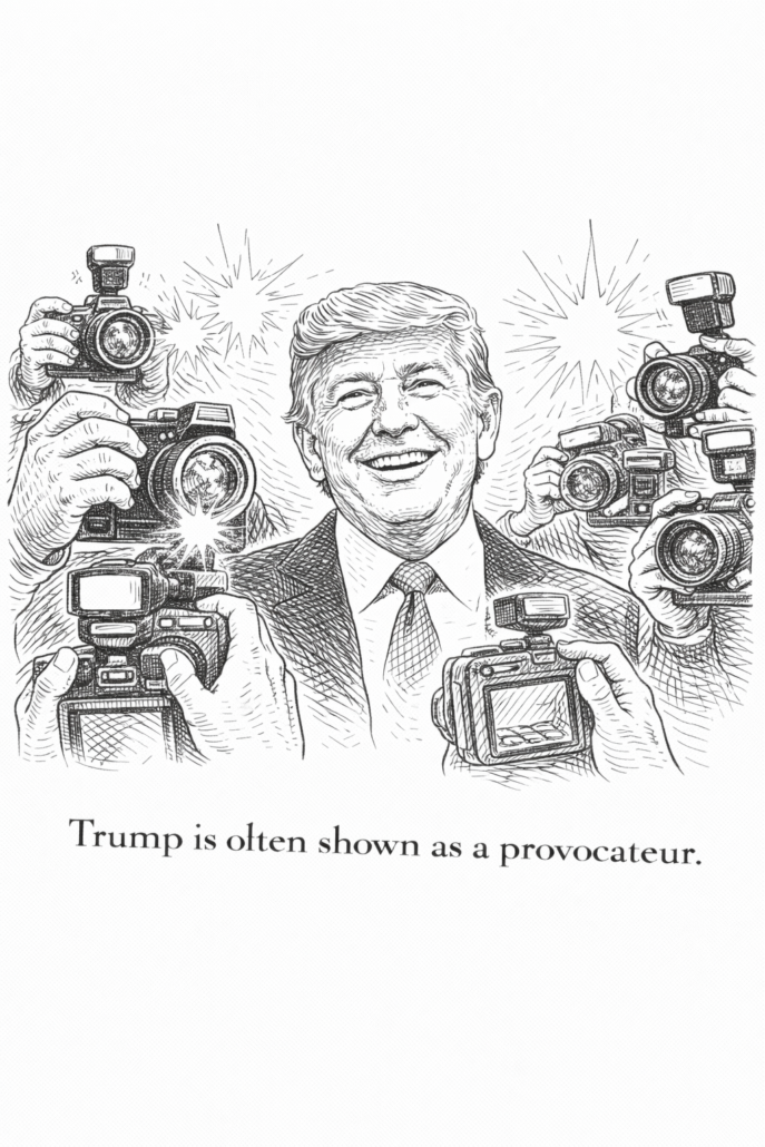 Often portrayed visually with themes of chaos, outrage, protests, and media frenzy. Trump depicted as either a provocateur or a central figure amid turmoil